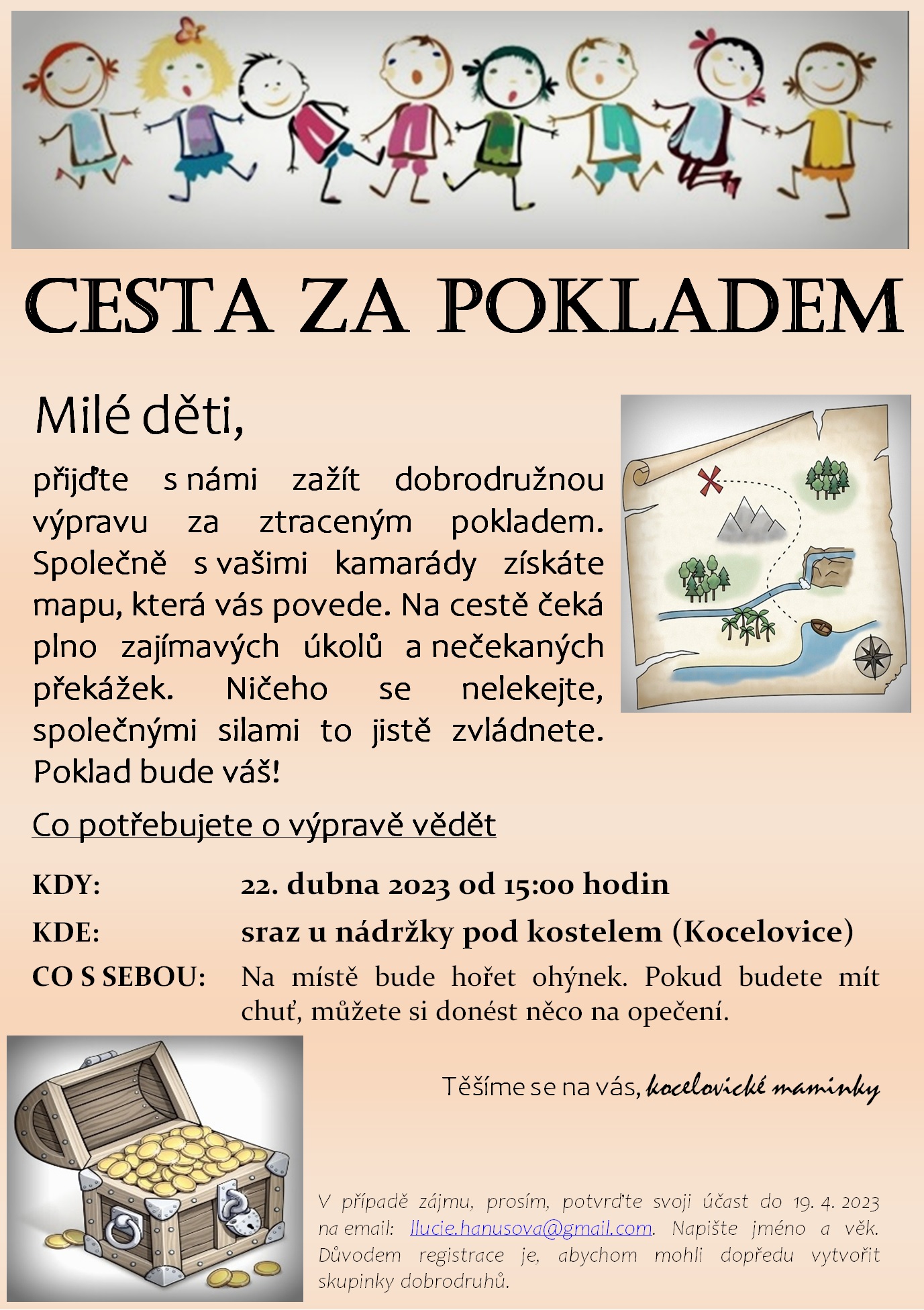 22. dubna 2023, bylo překrásné slunečné sobotní odpoledne, které po tolika deštivých a chladných dnech asi čekal málokdo. Není tedy divu, že jindy velice poklidný život v Kocelovicích rozvířily skupinky malých nadšenců, kteří se odhodlaně vydali hledat ztracený poklad. Jejich kroky vedla mapa a touha po dobrodružství. Cesta to nebyla jednoduchá.