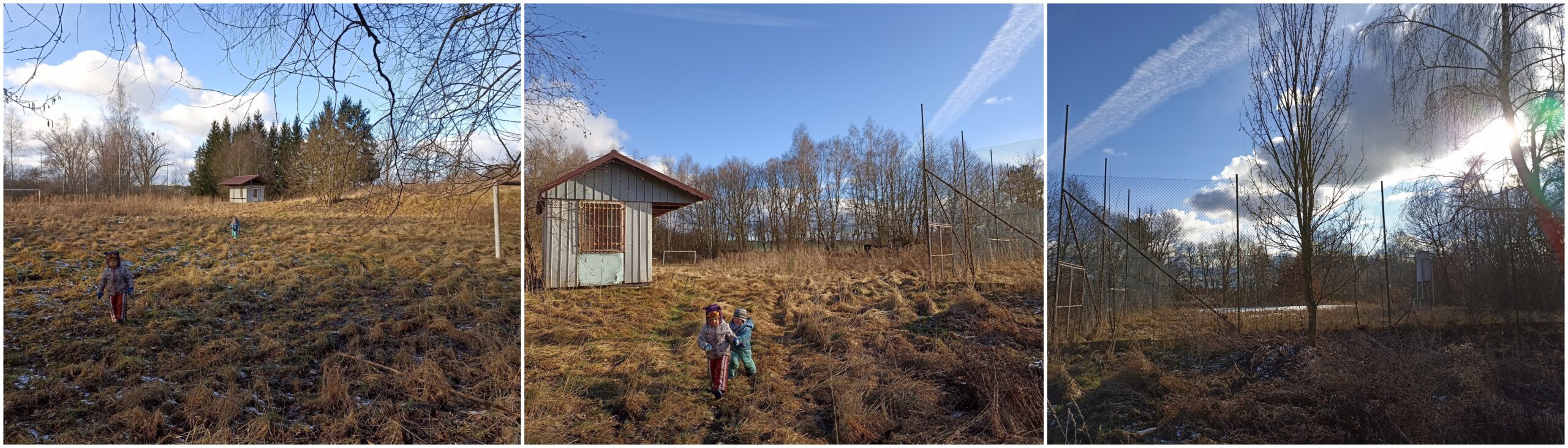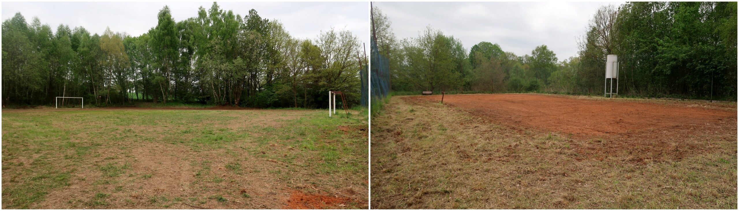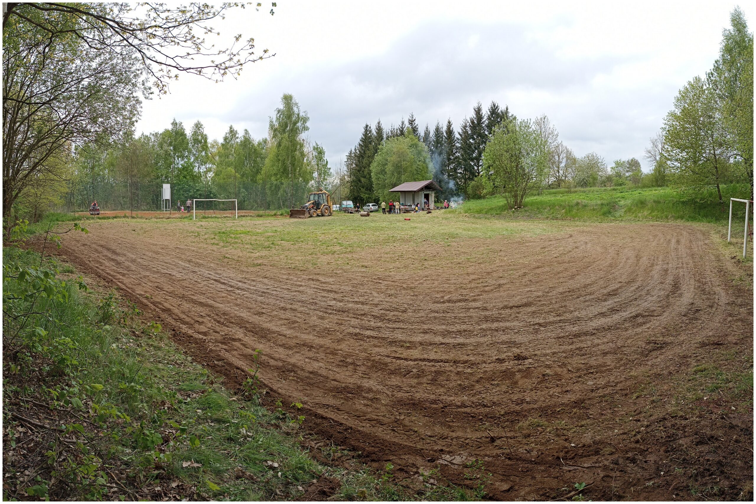 Když jsme se v sobotu ráno v půl desáté sešli na místě, obloha byla zatažená a ani předpověď nehrála v náš prospěch. Nakonec se ale počasí umoudřilo a přidalo se na naši stranu. Hlavním cílem bylo shrabat a dorovnat terén fotbalového hřiště, zasít trávu, vyčistit povrch antukového kurtu, odstranit z místa drobné náletové dřeviny, posbírat odpadky v bezprostředním okolí a pokusit se vytvořit alespoň provizorní zábranu proti opětovnému vstupu divočáků. Velký kus práce z hlediska srovnání terénu již v rámci přípravy provedl pan Barnáš s těžkou technikou a pan Radil, který trávu posekal.