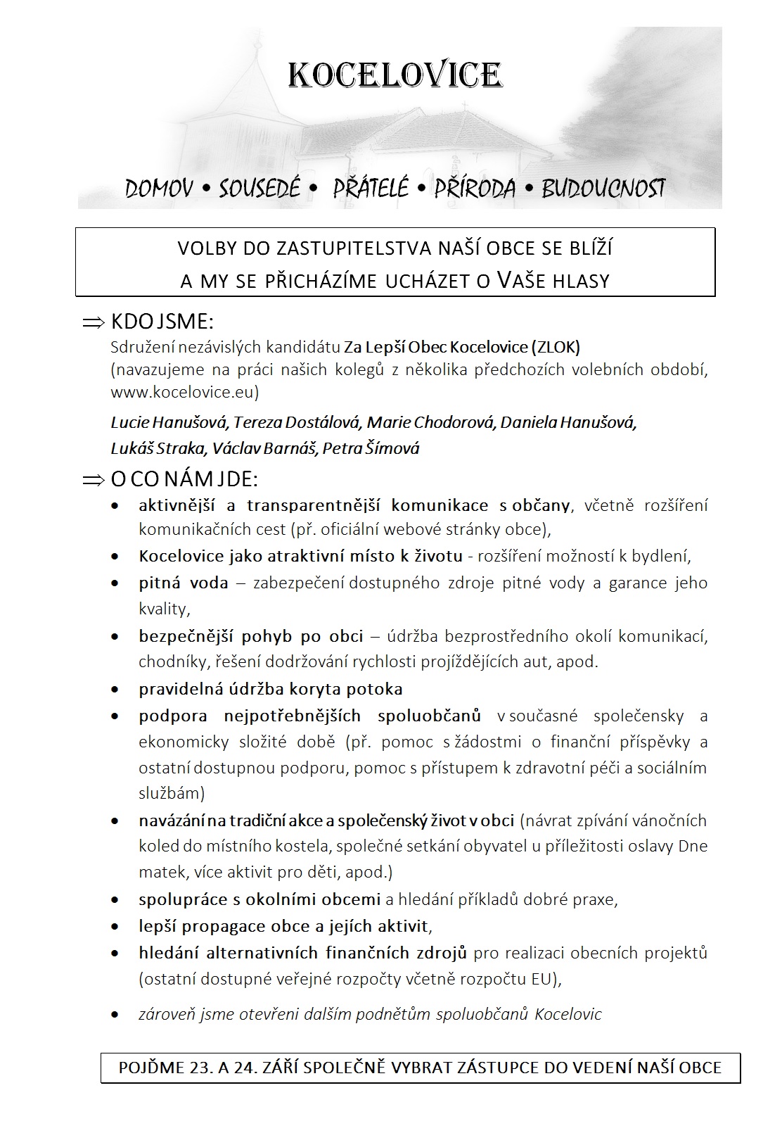 Jsme skupinkou občanů Kocelovic, kteří se v komunálních volbách 2022 rozhodli sestavit listinu nezávislých kandidátů a ucházet se o místa v zastupitelstvu naší obce. Primárním cílem a motivací pro nás bylo získat větší vhled do vedení obce a možnost aktivně se podílet na dění v Kocelovicích.